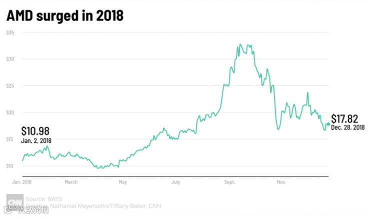 AMD自去年9月中旬以来下跌了46%,但仍夺得桂冠。AMD今年一度上涨超过200%。但出于对全球经济放缓和贸易战可能升级的担忧,厌恶风险的投资者在年底撤出了科技股。