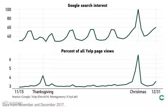 圣诞节期间,中餐的搜索量猛增,比一年当中其他任何时候都多。相关的短语“中餐营业”“中餐我附近”这些搜索组合也出现了类似的登顶。在美国最大的点评网站Yelp上,过去六年中国餐厅的浏览量都在12月25日达到巅峰,比平时的浏览量多两倍以上。