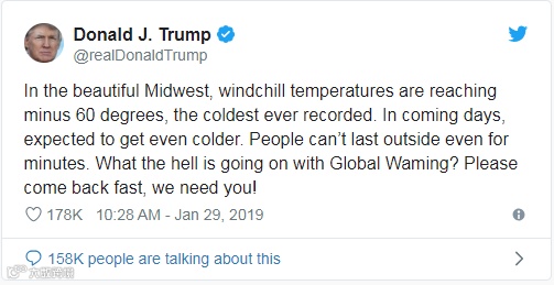在得知美国中西部正在经历极寒天气后,连一贯不相信气候变化的特朗普也开始呼唤全球变暖“快回来”。他在社交平台上发文称:“接下来的几天可能会更冷,人们在外面连几分钟都坚持不了。全球变暖到底怎么了?快点回来,我们需要你!”