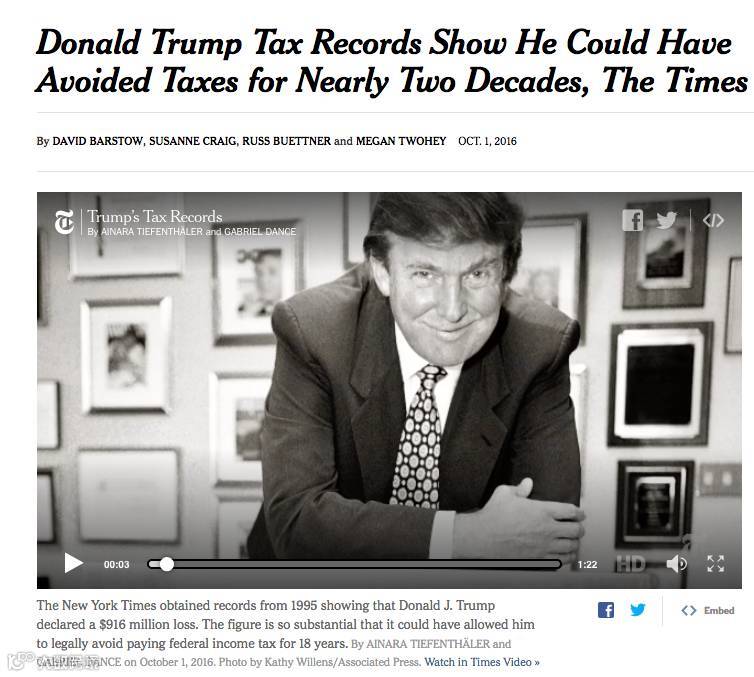 媒体当然不会轻易放过这个答案。2016年10月,《纽约时报》披露了一份特朗普1995年的所得税申报单,显示他旗下企业经营不善造成净亏损9.16亿美元,根据美国国税局的规定,投资事业遭遇重大亏损时经申报核定后,可以免除申报前3年及后15年的联邦税额,得到巨额商业亏损免税额。税务专家推断,凭借这笔亏损,特朗普可能在多达18年内没有缴纳联邦所得税。