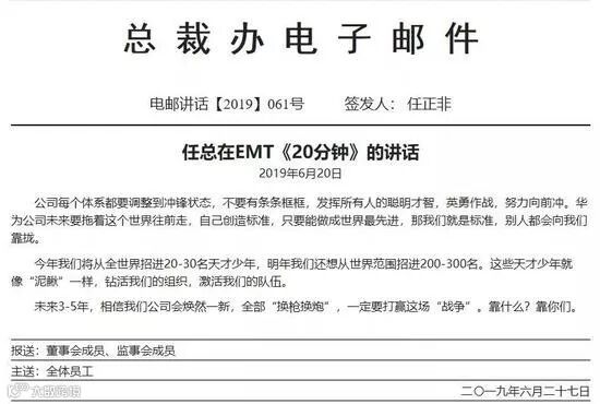上述电邮表示:“华为公司要打赢未来的技术与商业战争,技术创新与商业创新双轮驱动是核心动力,创新就必须要有世界顶尖的人才,有顶尖人才充分挥发才智的组织土壤。”