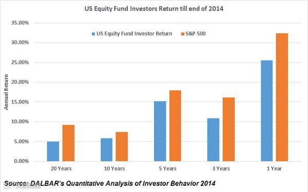 在1995年至2014年的20年间,股票型基金的投资者在美国每年的平均回报率是5%,而标普500在同一期间每年回报9.22%。债券型基金的投资者平均每年获得了0.71%的回报,而同期年通胀率为2.37%,全球债券指数的回报则达到了每年5.74%。不管是股票还是债券基金投资者,其回报都远逊于呆而不动的傻瓜型投资策略。