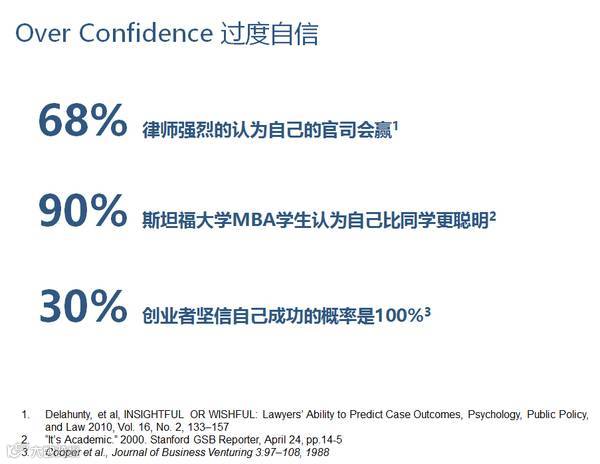 其次,大多数人都受到“过于自信的偏见”的影响。过度自信偏见是指人们的习惯性过高估自己的技能和成功的机会。例如,下面的图例中有不少过度自信的例子。