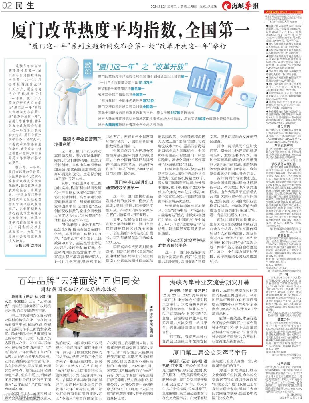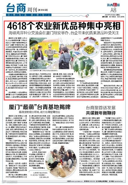 2024年12月24日,《海峡导报》在头版刊发:“海峡两岸种业交流会翔安开幕”文章。