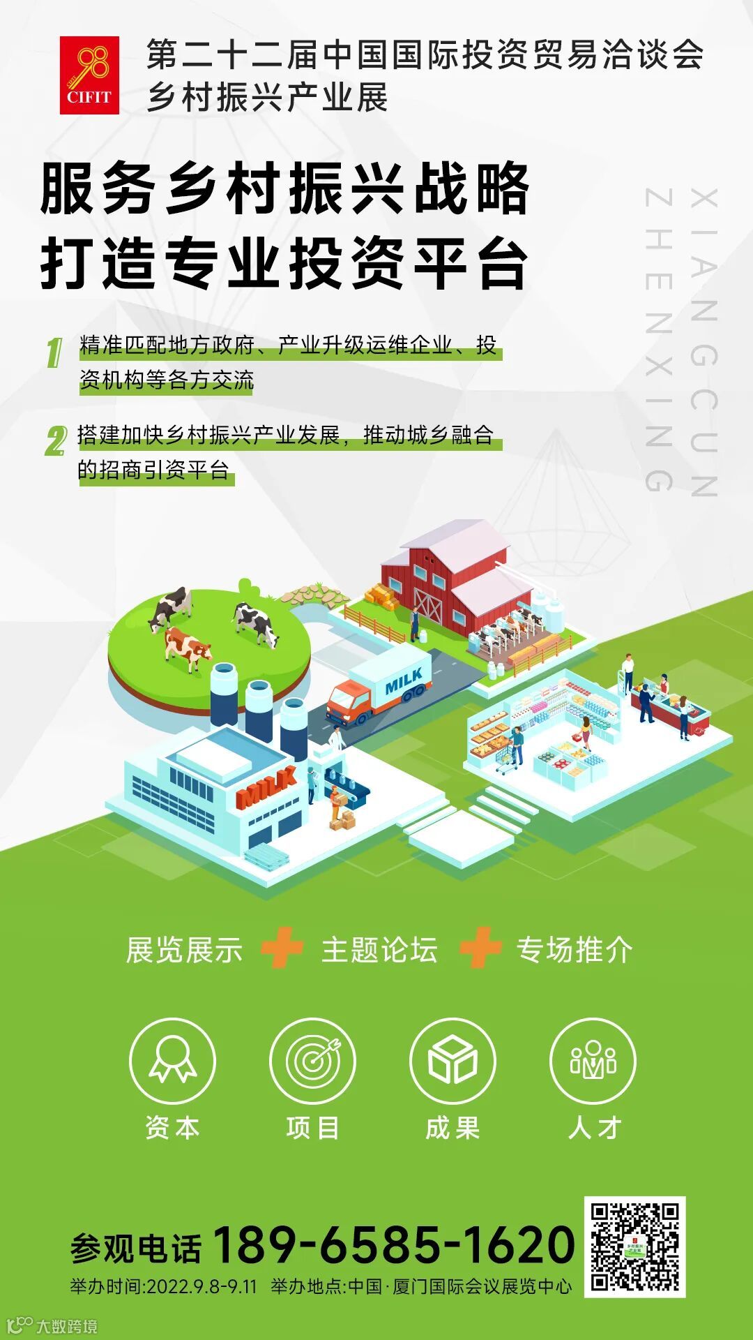 第二十二届中国国际投资贸易洽谈会·乡村振兴产业展将于9月8-11日在厦门国际会议展览中心B1馆举办,展会围绕资本、项目、成果和人才四大核心元素,打造多方投洽合作平台。