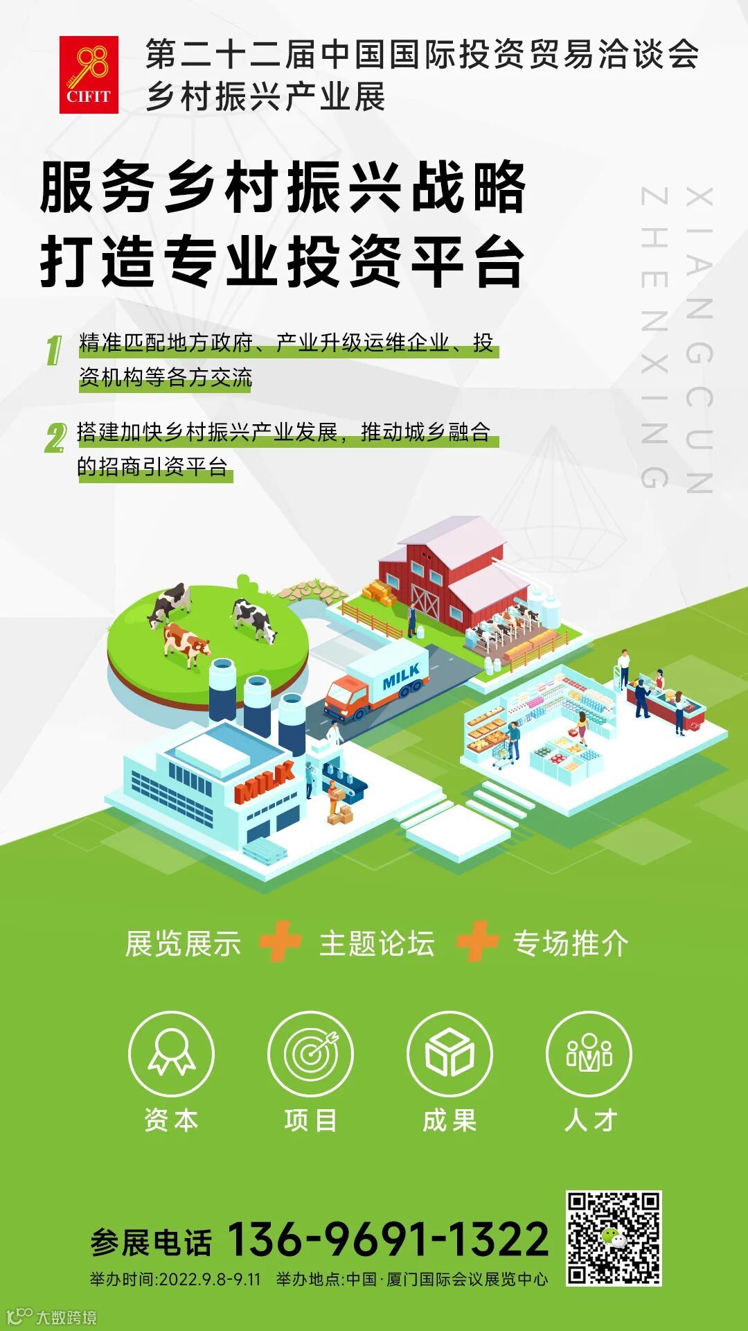 同时,本届“乡振展”将于8日上午举行开馆仪式,将邀请行业相关嘉宾出席。展期实行“展会+论坛”模式,将举办乡村振兴发展论坛——围绕政策解析、投资方向和具体案例分析等,对现代农业投资与乡村振兴的实施路径、推进方法、具体措施展开深入讨论;另有专场推介会——匹配区域、乡村振兴产业运营企业、投资机构和乡村振兴项目等各方需求,推动地方政府与企业、投资方进行洽谈,拓展合作模式。