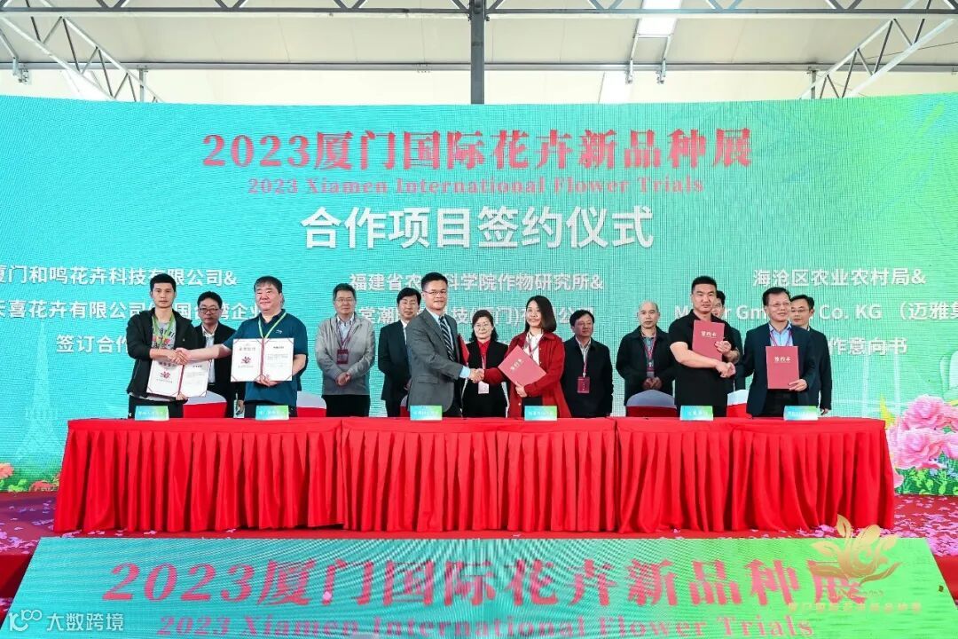 在本届新花展的开幕式现场,举行了花卉产业招商引资重点项目集中签约仪式。其中,海沧区农业农村局与Mayer GmbH & Co. KG (迈雅集团)签订合作意向书,双方将立足“理念相通、利益相连、目标契合”为落脚点,充分发挥“政+企”协同效应,积极推进“优势互补、资源共享、人才联动、同频发展”四大格局,聚焦花卉产业精准发力,全面推进乡村振兴战略实施,实现共谋、共享、共赢。