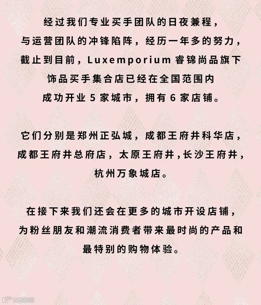 Luxemporium睿锦尚品是王府井集团旗下的大型奢侈品集合商店,为消费者打造与欧美“ One stop shopping ”的时尚购物体验。