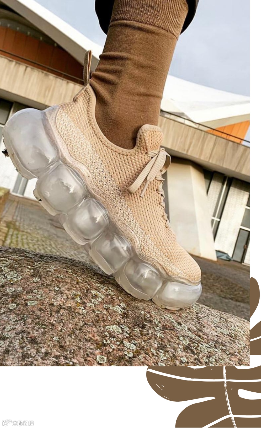 如果你对球鞋比较熟悉,看到 grounds 产品的第一眼一定会联想到 Nike 于2017年推出的 VaporMax 系列球鞋。只不过坂部三樹郎设计的“气垫”要更大、更浮夸、更夺眼球。不过,官方对此的解释是,grounds 的球鞋和别的 Air 系列球鞋不同,他们的气垫不是充气的,而是在里面添加了一根根支柱进行支撑,在保持柔软脚感的同时,无需担心气垫破裂漏气的情况。