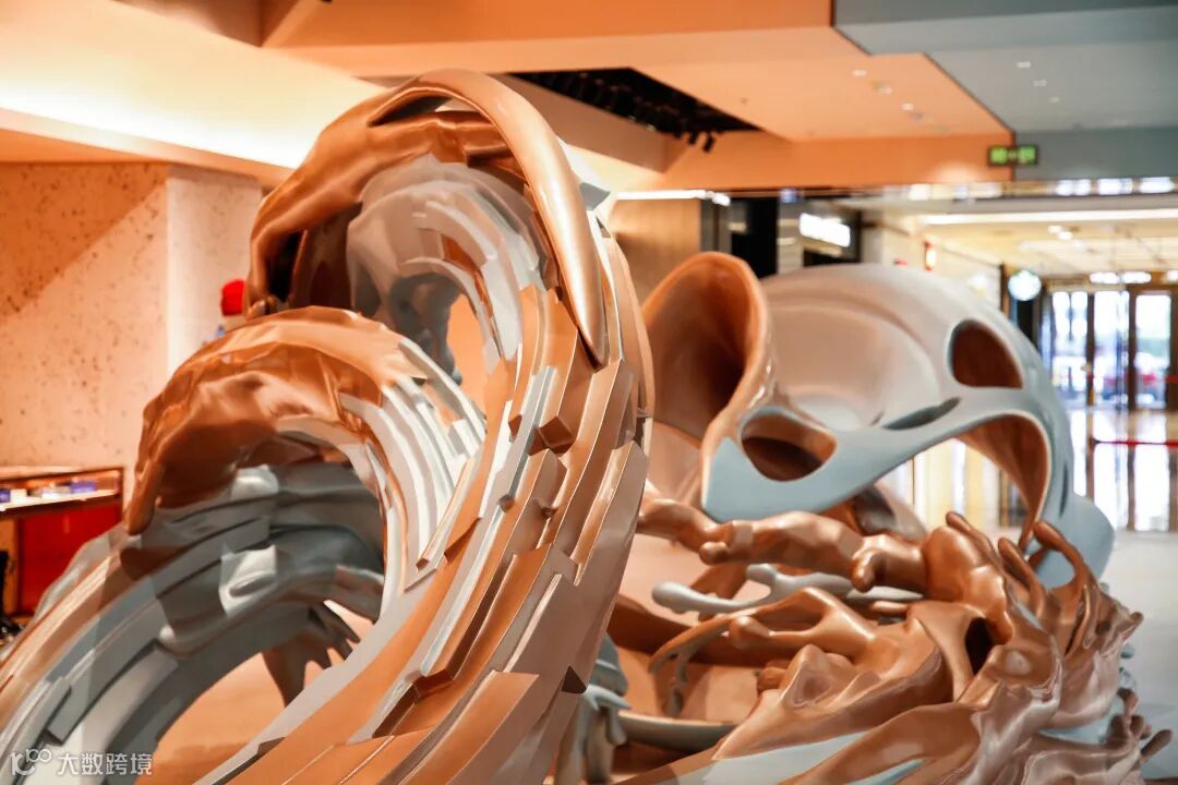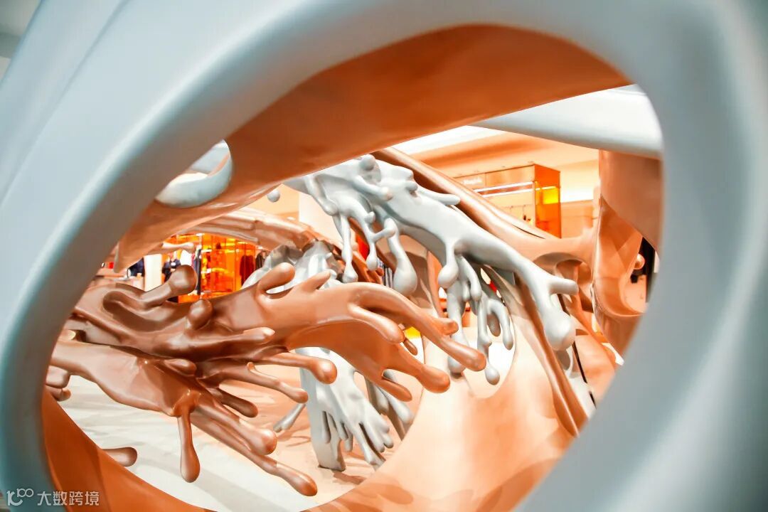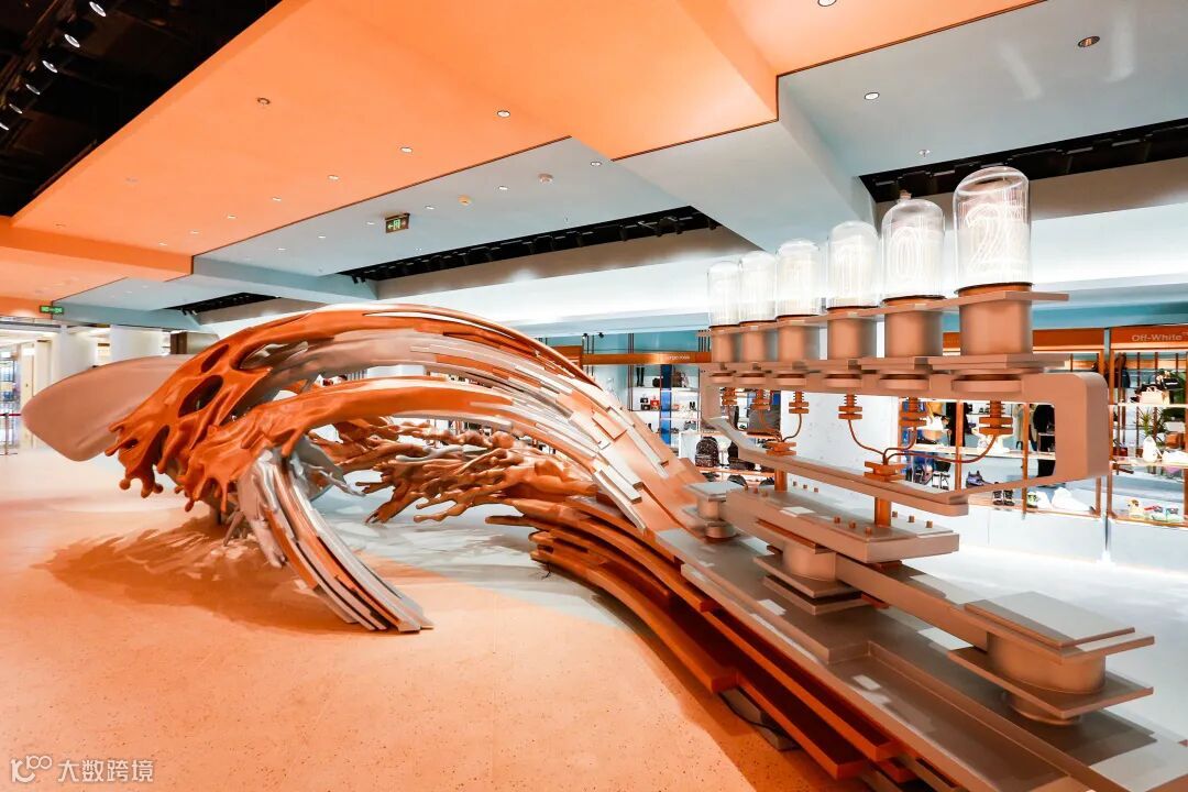 Luxemporium 睿锦尚品成都王府井科华店还在服饰区和鞋包区中间设置了一个巨大的“平行宇宙” 3D 打印雕塑。设计师由 NASA 于2020年在南极进行宇宙射线探测中的新发现为灵感,通过极为复杂的 3D 打印工艺制造了这一非固定造型的延伸体。设计师也藉由此雕塑,强化平行世界的对时间这无法捉模的关系提供具象感,希望观赏者能从中感受这奥妙。