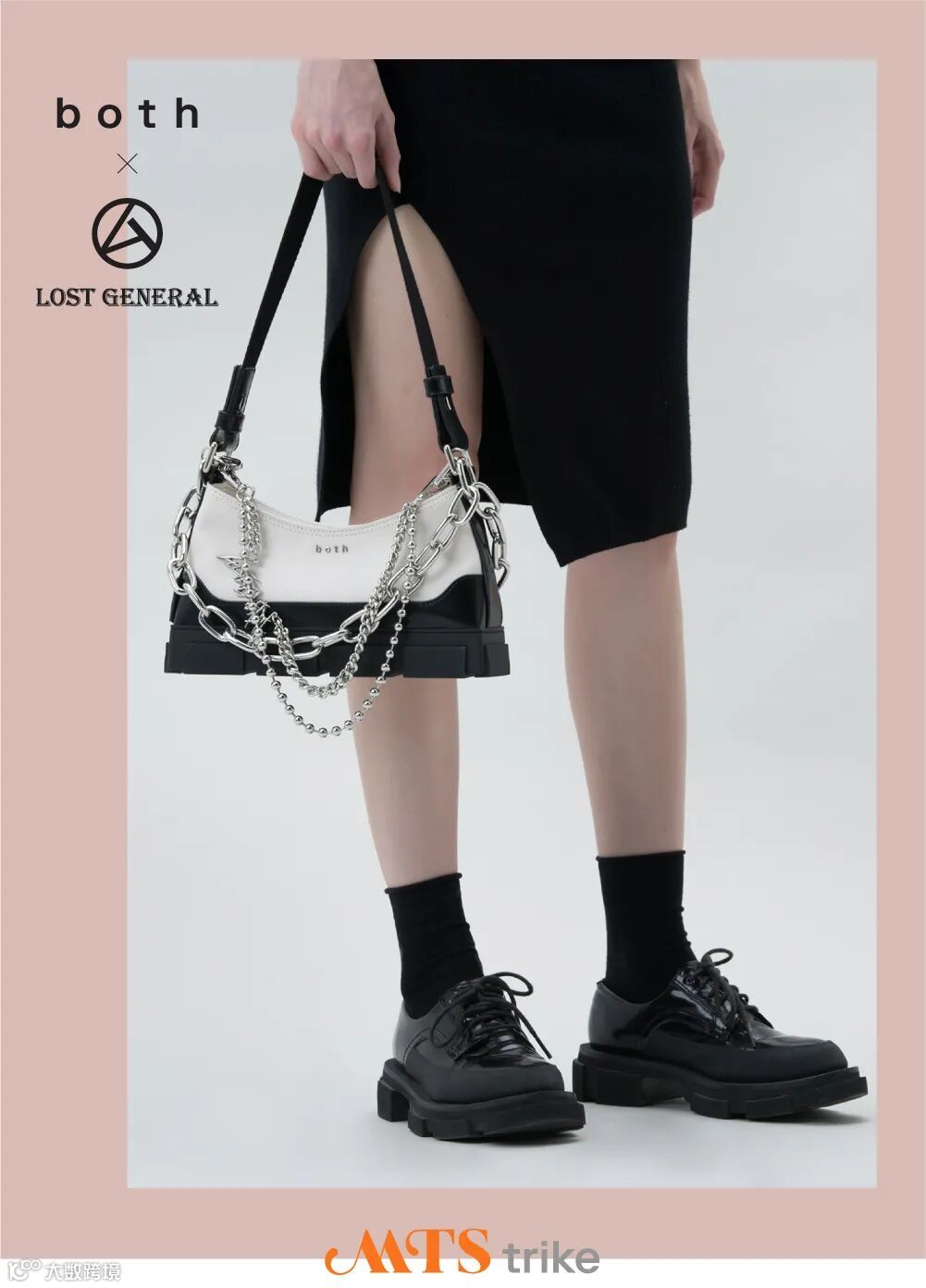 在本次 both x Lost General 的联名系列中,Lost General 以其崭新的视角,对 both GAO 家族的三位成员进行二次重塑,共释出包括GAO Bag 、GAO Chelsea、GAO Loafer在内的三款独家联名产品。延续隽永的黑白经典,贯彻摇滚不死的朋克精神,本次合作款鞋履在 both 经典GAO Loafer乐福鞋、GAO Chelsea切尔西靴的基础上进行重新演绎,特制钢制金属包头的加入,更添硬核街头感。