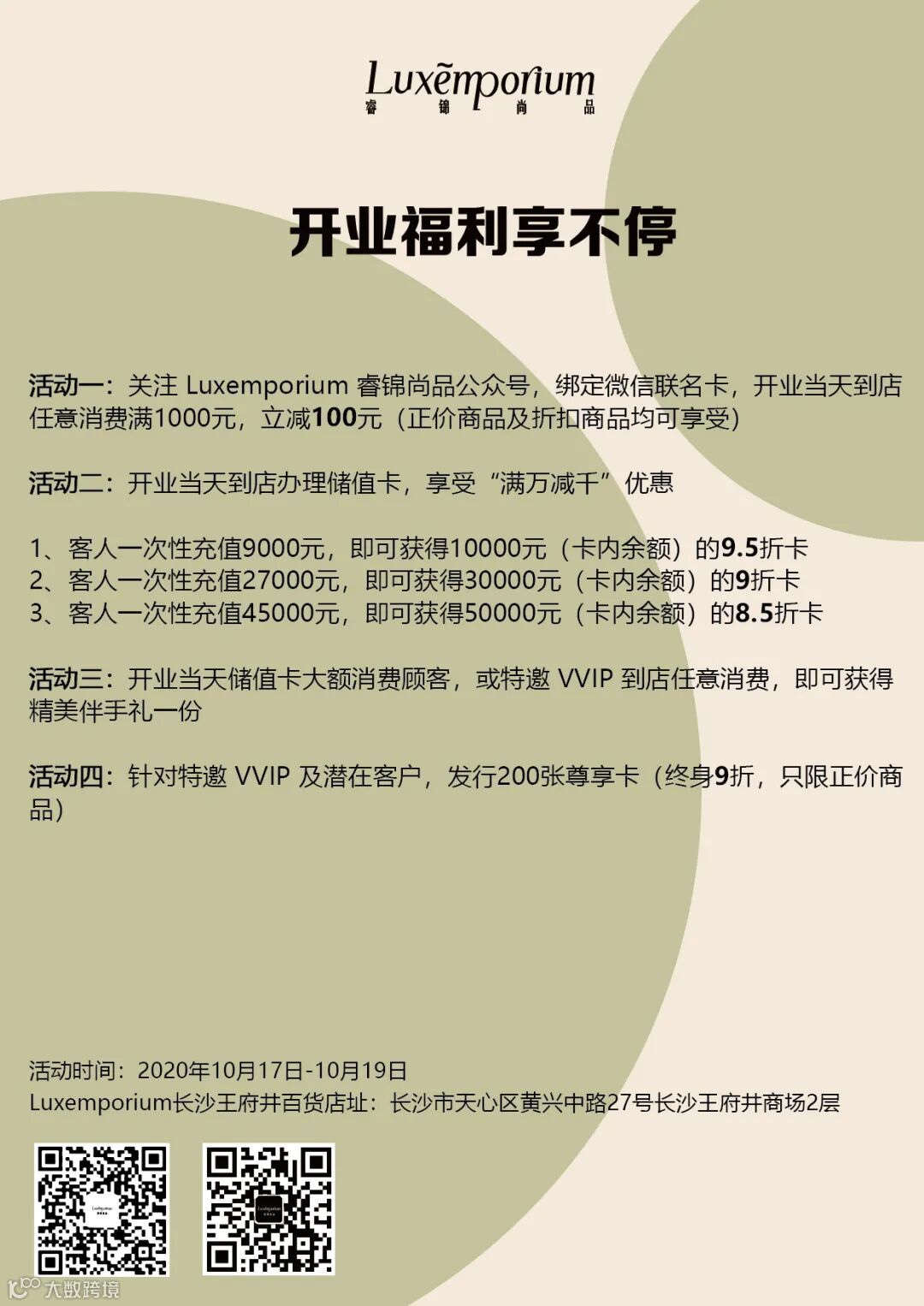 除了精彩的活动外,在10月17日正式开业当天及后面两天,我们也为大家准备了丰富的优惠福利活动(详见上图),助力大家更好地买买买~