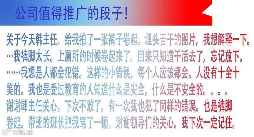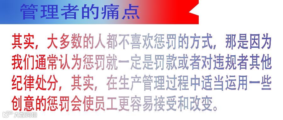 把单一的罚款方式改成多样式:让违章员工可以选择罚款、打扫其他车间卫生、写检讨念检讨、还是去家访,看教育视频,写分享感受再写承诺、让员工抄写违反的规章制度或让家属一起抄。