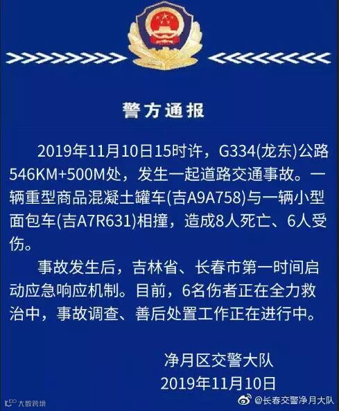 11月10日15时许,长春G334(龙东)公路发生一起道路交通事故。一辆重型商品混凝土罐车与一辆小型面包车相撞,造成8人死亡、6人受伤。