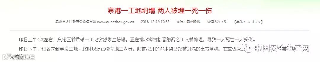 12月18日上午9点左右,泉州泉港区前黄镇一工地突然发生坍塌,正在排水沟内接管的两名工人被掩埋,导致1死1人伤。据事发工地的承包人介绍,当天上午铺设排水管道,其中潘某和何某二人俯身在2米深的沟里接排水管,排水沟一侧土方突然坍塌,大量土方将正在沟底施工的何某、潘某二人掩埋。
