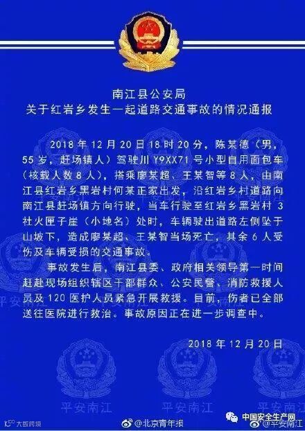 12月20日18时20分,四川南江县一小型自用面包车(核载人数8人),行驶至红岩乡黑岩村3社火匣子崖(小地名)处时,车辆驶出道路左侧坠于山坡下,造成车上2人当场死亡,其余6人受伤及车辆受损的交通事故。