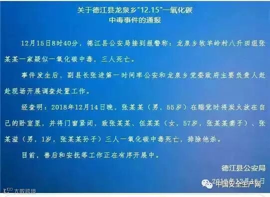 12月16日,贵州铜仁市德江县公安局发布通报:14日晚,龙泉乡牧羊岭村八升田组张某某一家发生一氧化碳中毒,三人死亡。张某某(男,55岁)在睡觉时将炭火放在自己的卧室里,并将门窗紧闭,致张某某、伍某某(女,57岁,张某某妻子)、张某溢(男,1岁,张某某孙子)三人一氧化碳中毒死亡。