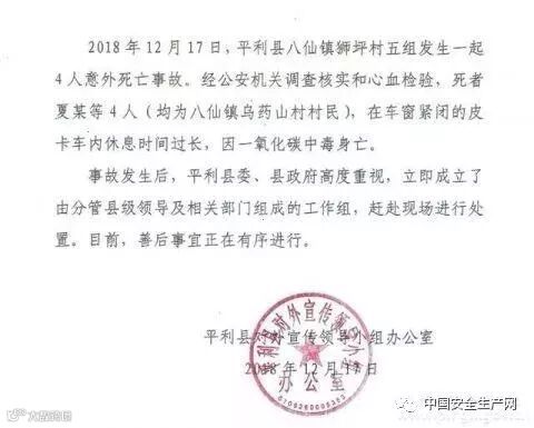 12月17日,陕西安康市平利县八仙镇狮坪村五组发生一起4人意外死亡事故。经公安机关调查核实和心血检验,死者夏某等4人(均为八仙镇乌药山村村民),在车窗紧闭的皮卡车内休息时间过长,因一氧化碳中毒身亡。