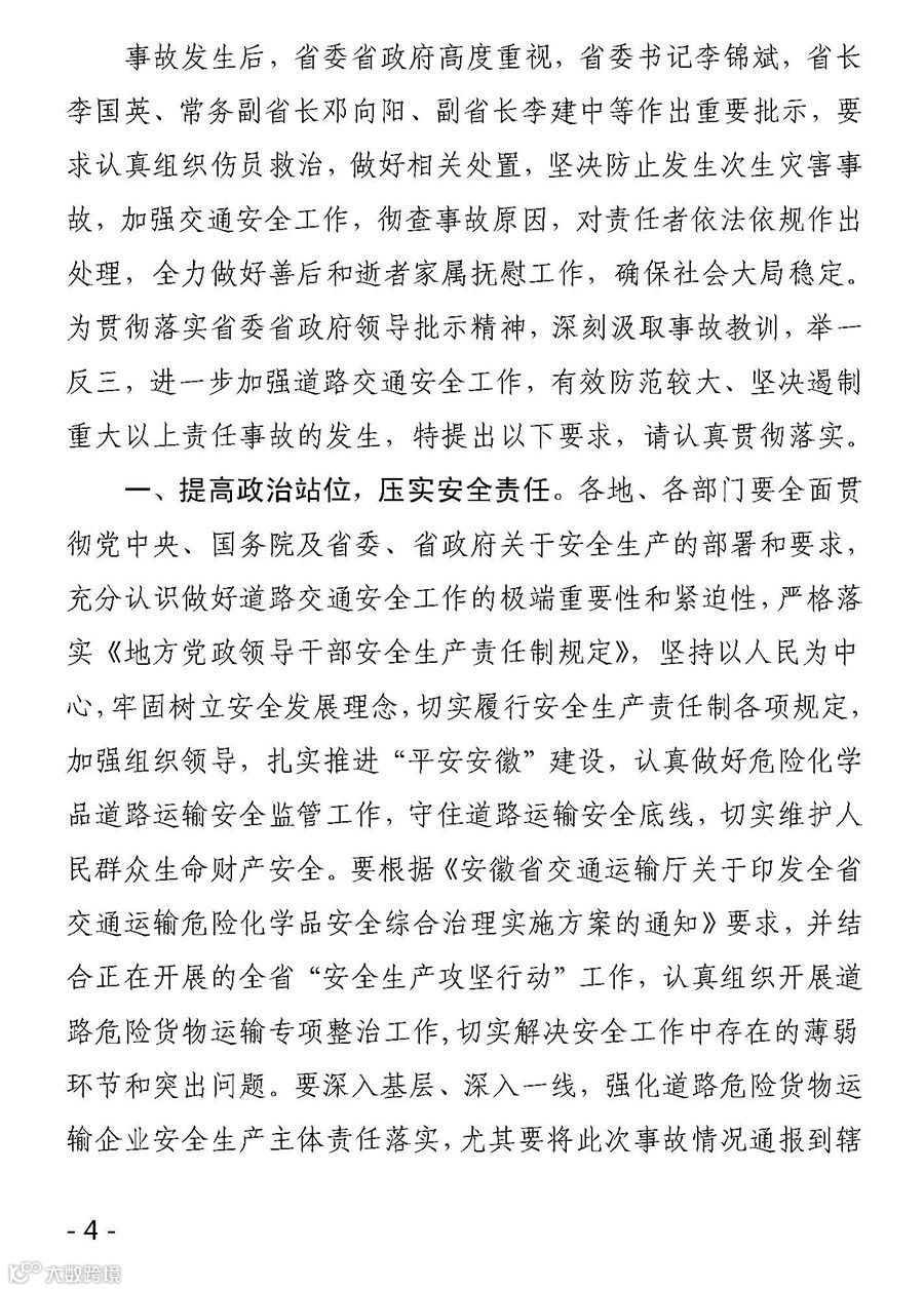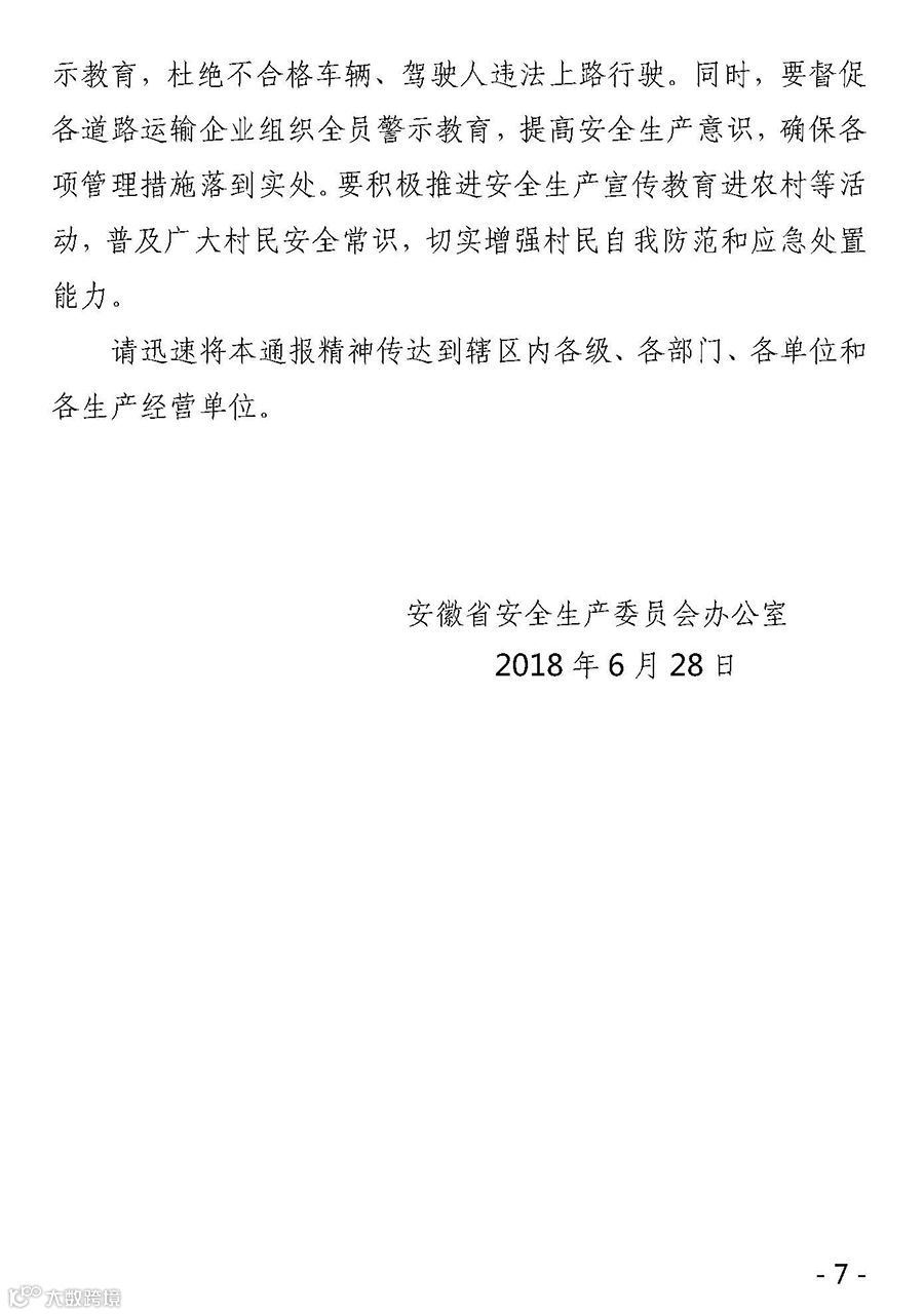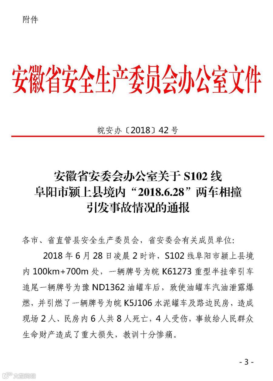 通报S102线阜阳市颖上县境内“2018.6.28”两车相撞引发事故情况。请深刻吸取事故教训,举一反二,同时深入开展企业货运车辆、电动自行车安全专项治理,全面开展隐患排查治理,严格落实各项安全防范责任措施,坚决遏制各类事故发生。