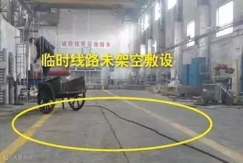 排查依据:《电气安全管理规程》(机械工业部[86]机生字 76号)第20条 临时线路必须采用绝缘良好的导线,应用电杆沿墙用合格瓷瓶固定架设,导线距地面的高度室内应不低于2.5m。