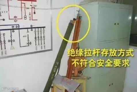 排查依据:DB 11527-2008《变配电室安全管理规范》5.18.5 绝缘拉杆应悬挂或架在支架上,不应与墙接触。