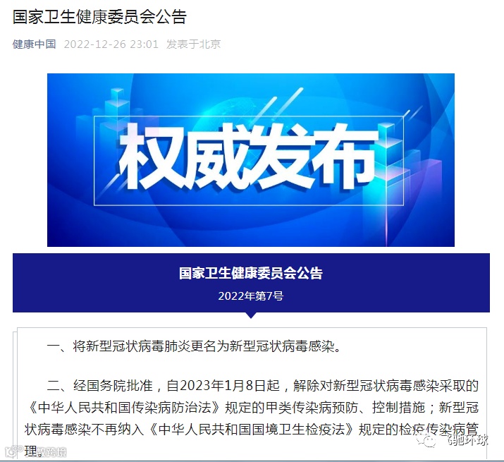 新冠肺炎更名为新冠感染,2023年1月8日起,解除对新冠感染的甲类传染病防控措施。