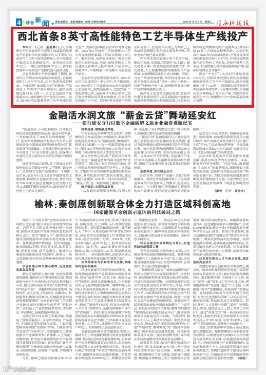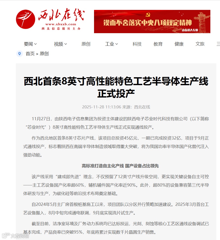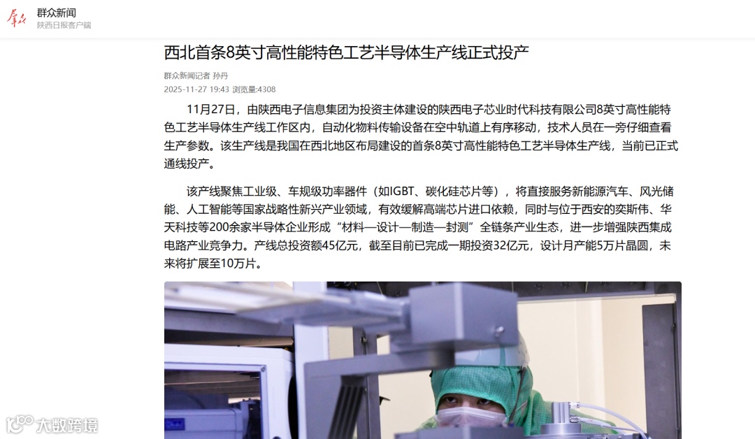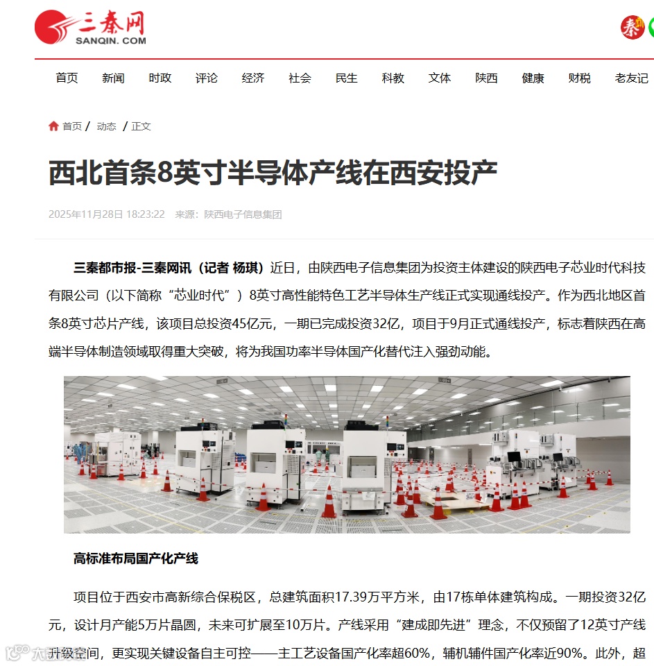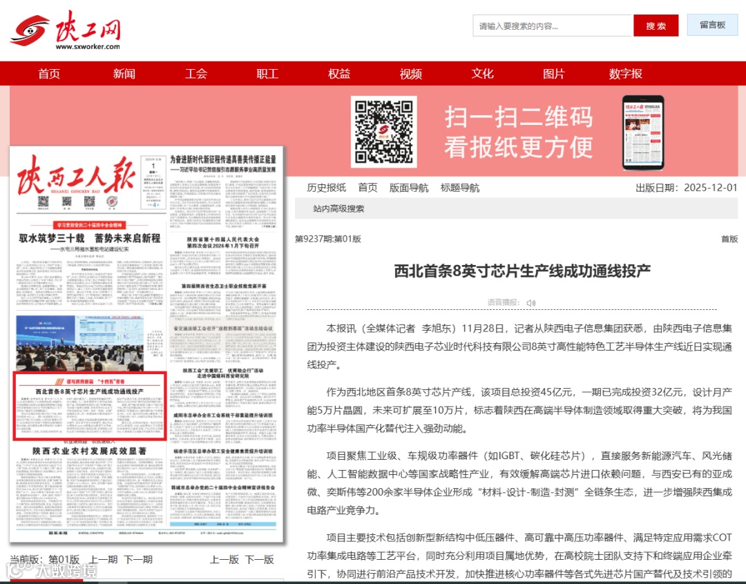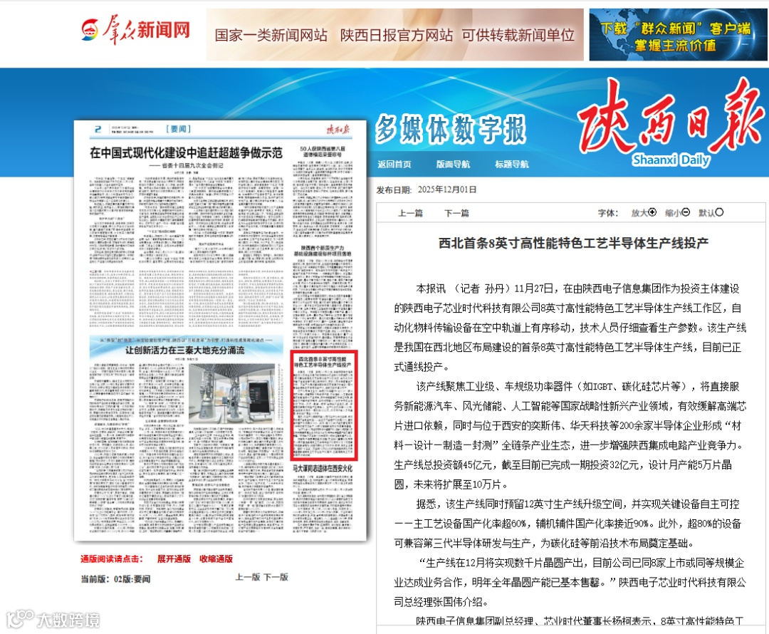 8英寸高性能特色工艺半导体生产线投产标志着陕西在高端半导体制造领域取得重大突破,将为我国功率半导体国产化替代注入强劲动能。该项工作引起了陕西新闻联播、陕西日报、群众新闻网、陕西工人报、陕西科技报、三秦网、西北信息报等多家媒体的关注。