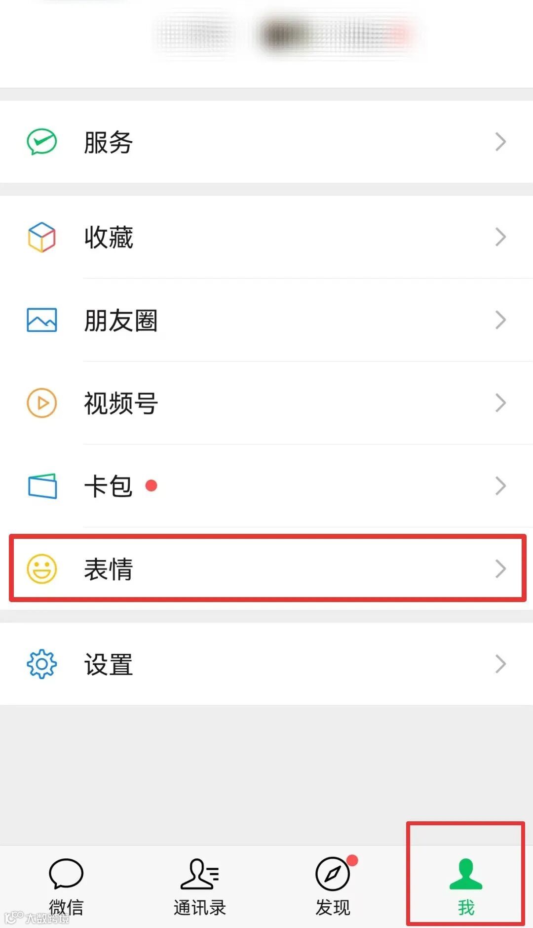 1.在微信页面下方菜单栏,点击最右侧的【我】,再点击【表情】,进入微信表情商店。