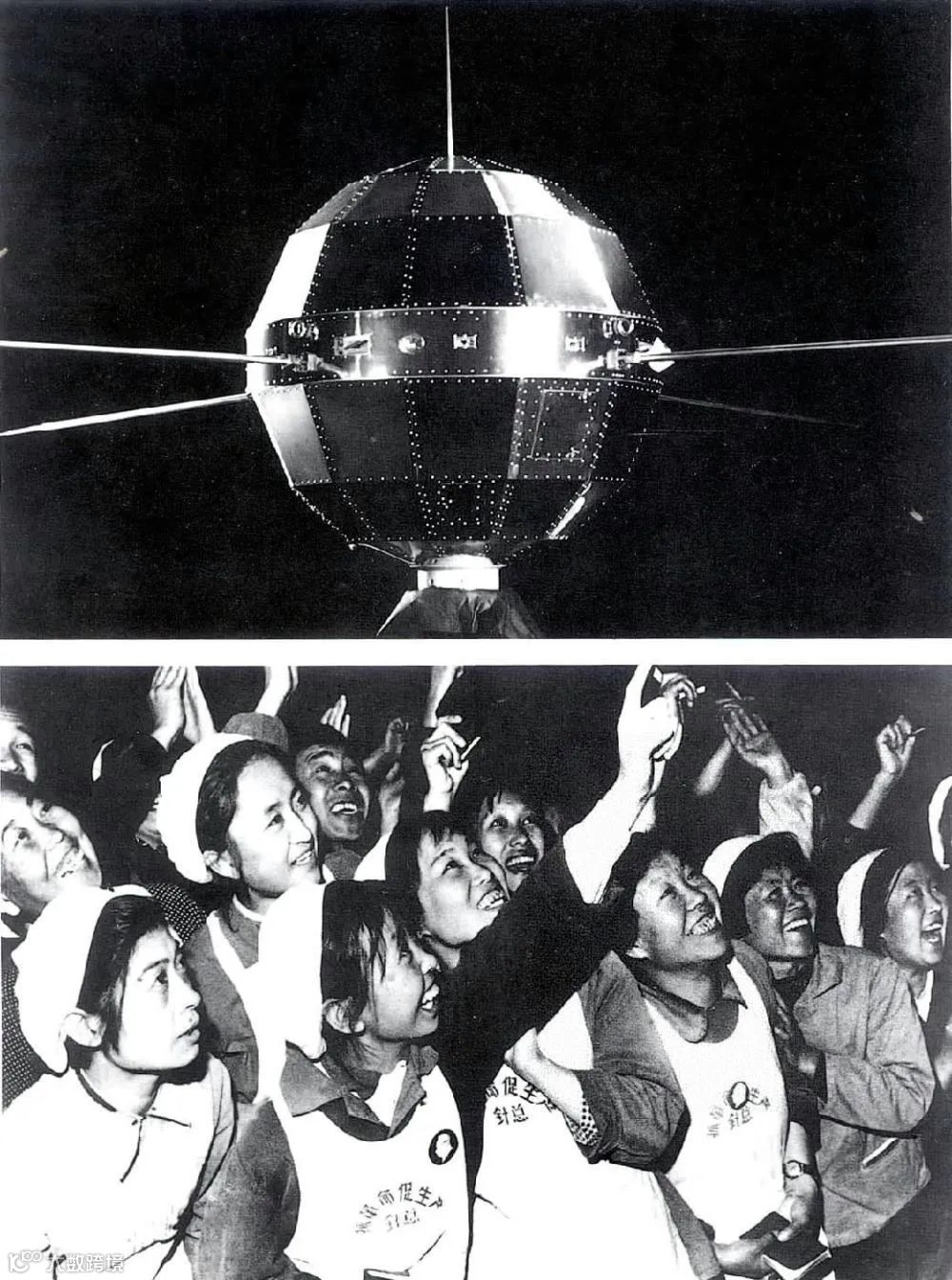 1970年4月24日,中国第一颗人造地球卫星“东方红一号”成功发射。上图:中国第一颗人造地球卫星“东方红一号”;下图:人们争相眺望通过北京上空的“东方红一号”。(新华社发)
