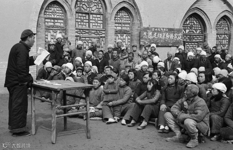 1950年5月,新中国成立后制定的第一部法律——《中华人民共和国婚姻法》公布施行。图为20世纪50年代,在山西黎城县仵桥村全村大会上,群众学习婚姻法。(新华社记者陈之平 摄)