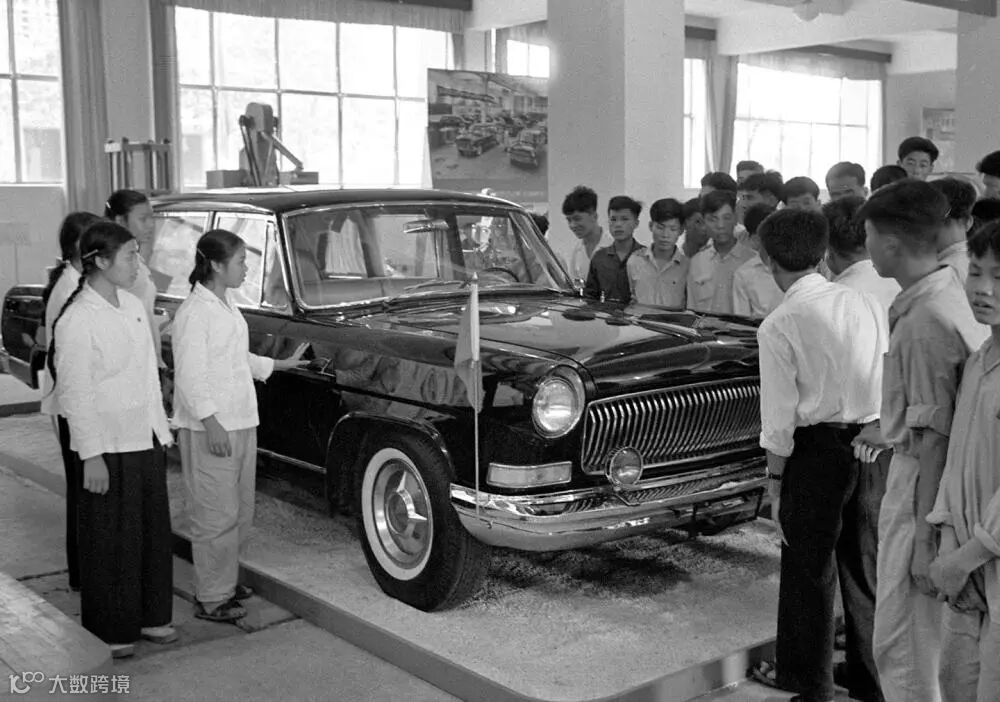 1958年,第一辆“红旗”牌轿车诞生。图为1967年春季广州出口商品交易会上,人们在参观展出的新产品“红旗”牌三排座高级轿车。(张家昌 摄)