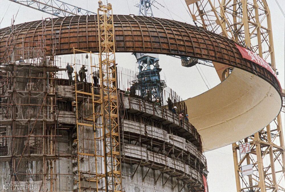 1991年12月15日,中国自行设计、自行建设的第一座核电站秦山核电站并网发电成功。图为秦山核电站反应堆安全穹顶正在吊装。(中国照片档案馆馆藏)