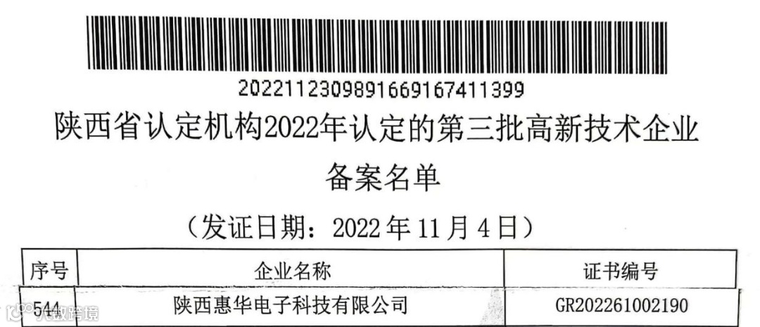 近日,全国高新技术企业认定管理工作领导小组办公室正式发布公告,公布了陕西省2022年认定的第三批高新技术企业备案名单,惠华公司成功通过国家高新技术企业认定。