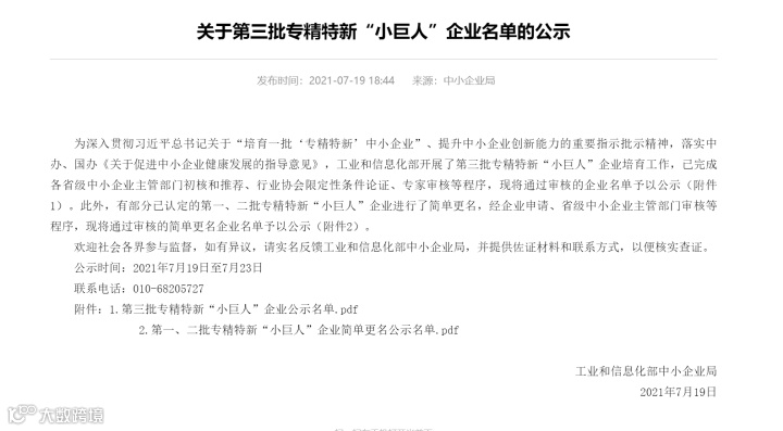 专精特新“小巨人”企业是指科技创新能力强,市场占有率高,质量效益优的“小而强”、“小而优”和“隐形冠军”企业,国家将为专精特新“小巨人”企业在资金、市场、技术、管理、融资等多方面提供支持,以帮助企业加快发展。经过省级中小企业主管部门初核和推荐、行业协会限定条件论证、专家审核等选拔环节,公司最终入围。