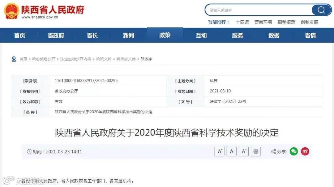据了解,2020年度陕西省科学技术进步奖共评选223项,其中一等奖26项,二等奖75项,三等奖122项。