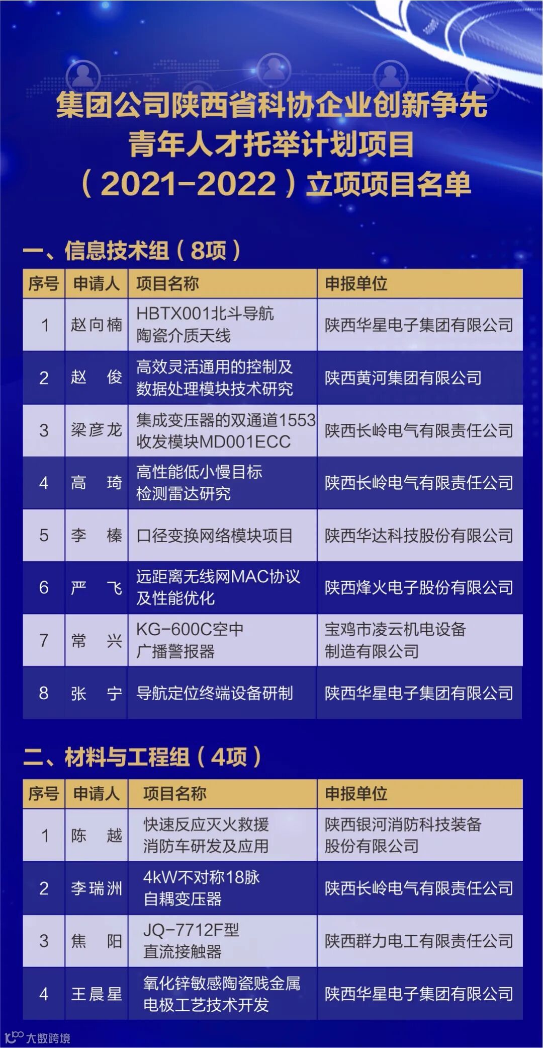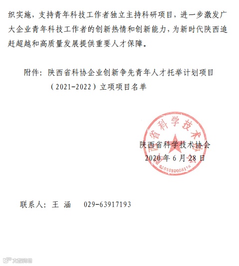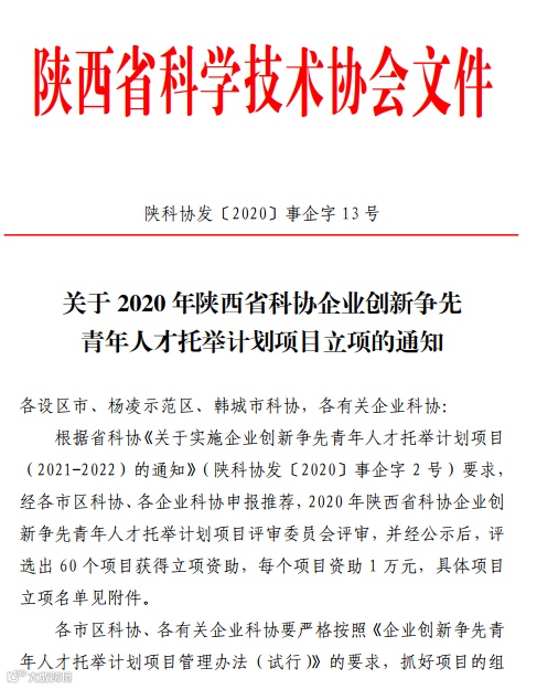 6月30日,陕西省科学技术学会发布了关于2020年陕西省科协企业创新争先青年人才托举计划项目立项的通知( 陕科协发〔2020〕事企字13号),2020年陕西省科协企业创新争先青年人才托举计划项目评审委员会评审,并经公示后,评选出60个项目获得立项资助,每个项目资助1万元,其中集团公司12个项目榜上有名,信息技术组8项、材料与工程组4项。