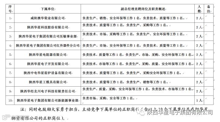 为打造一支信念过硬、政治过硬、责任过硬、能力过硬、作风过硬的干部队伍,进一步拓宽公司选人用人的渠道,激活现有干部的主观能动性,实现选人用人从“相马”到“赛马”观念的跨跃,让更多的人才脱颖而出,营造“能者上、平者让、庸者下”的良好氛围,为华星改革发展提供有力的人才保障,党委决定对公司范围现有的机关中层和下属单位副职岗位全部实行公开竞聘,也鼓励大家竞争下属单位的正职岗位。现将本次竞聘内容公告如下,欢迎有竞聘意向的员工踊跃报名参与。