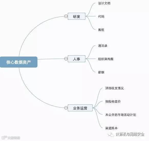 数据防泄露是一个非常复杂的工程,投入再多人力也不为过,但是互联网公司的安全人力大多非常有限,所以打蛇打七寸,我们需要先定义清楚什么是核心数据资产。通常理解会包含以下几大类: