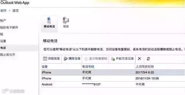 微软邮件系统自带一个十分强悍的功能,对于配置接受公司exchange邮件的移动终端,可以通过登录OWA页面直接远程擦除整个设备的内容并完全恢复出厂配置。