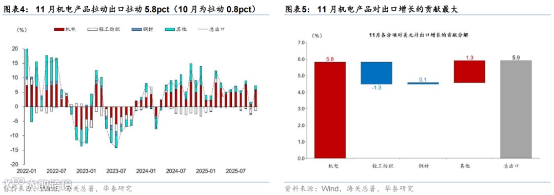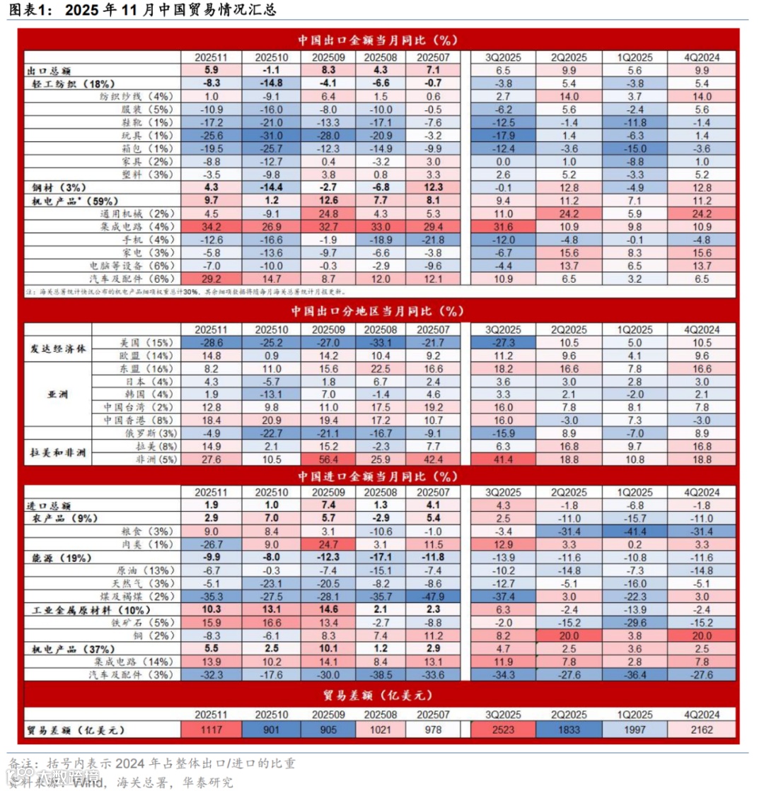 分产品看,集成电路和汽车出口仍维持强势,或显示全球AI投资热潮继续拉动半导体产业链出口。今年5月以来,占出口比重仅4%的集成电路对出口增长的贡献始终在1个百分点以上,11月贡献录得1.5个百分点,随着全球AI竞争加剧,半导体产业链的贸易有望维持强劲;11月汽车及配件出口金额增速上行至29.2%,对整体出口的贡献达1.6个百分点,显示中国平价汽车在全球竞争力进一步增强。此外,轻工纺织等商品出口同比降幅有所收窄、但整体延续负增,或显示部分劳动密集型产品产能布局调整的影响。