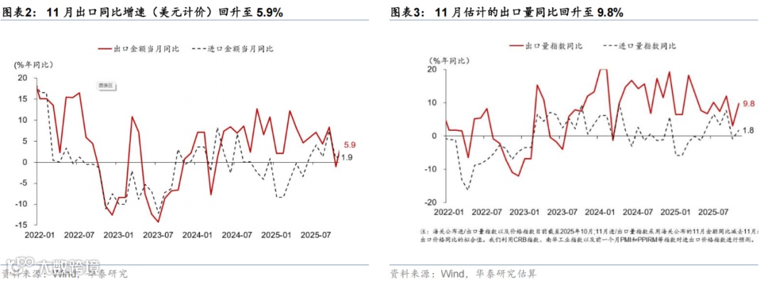 以美元计价,11月出口同比增速较10月的-1.1%回升至5.9%,显示此前假期错位带来的短期扰动消退后、出口增长维持较强韧性。9月以来、全球PMI连续4个月回升至扩张区间显示外需仍有支撑,而AI产业链周期及中国制造业竞争力提升等均有望结构性支撑出口景气度。11月集装箱吞吐量亦较10月的4.3%回升至7.4%,11月中国制造业新出口订单指数回升1.6pp至47.5%,11月韩国出口同比亦上行4.8pp回升至8.4%,均体现出10月假期错位的扰动消退,全球贸易需求延续较高景气度,出口如期回升。