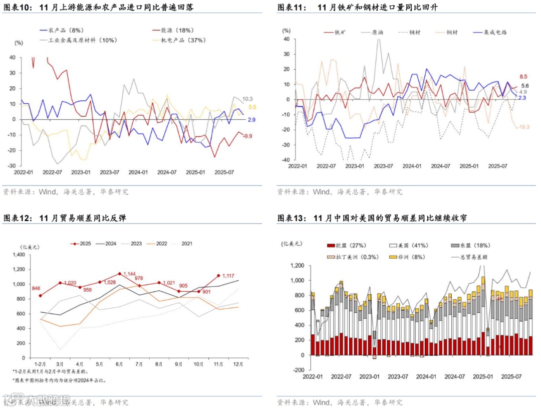 进口方面,11月美元计价进口同比较10月上升0.9个百分点至1.9%,中美贸易摩擦缓和、国内AI投资、低基数等共同推动进口改善。农产品及工业金属原料等上游商品进口大多回落,而中下游产品进口呈结构性回升,比如计算机和集成电路进口同比分别从上月的-27.2%/10.2%上行至6.8%/13.9%。此外,中国自11月10日起取消对美部分农产品最高15%的关税,11月自美进口同比上行3.7个百分点至-19.1%,对整体进口的拖累收窄0.3个百分点。