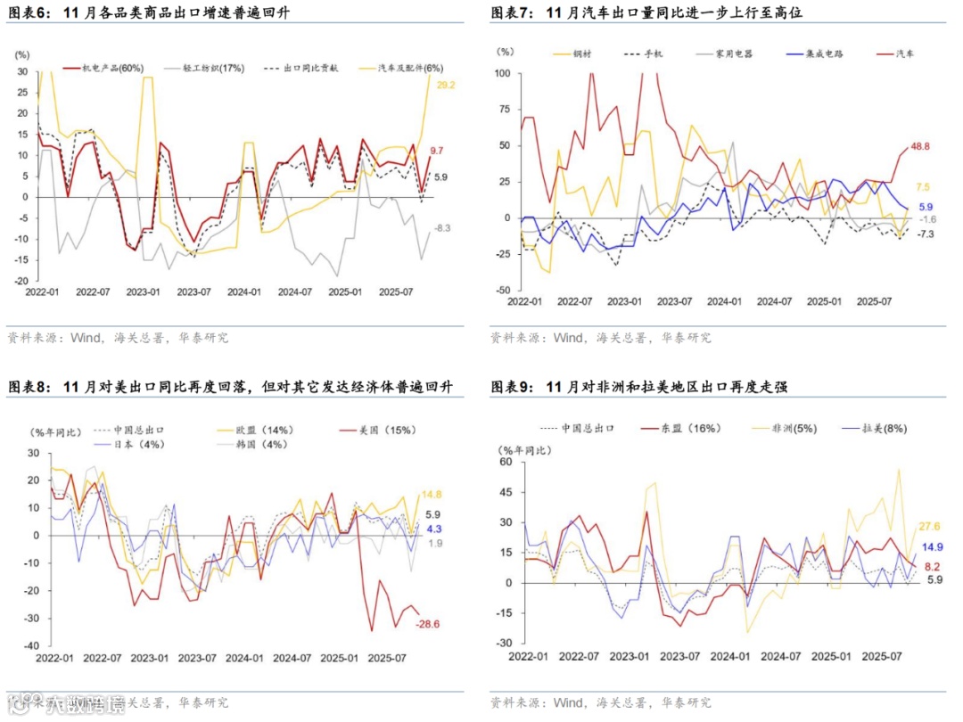 分地区来看,对美出口同比仍在低位,但对非洲与东盟出口维持韧性,对欧盟出口大幅回升。11月中国对美出口同比从10月的-25.2%回落至-28.6%,对整体出口的拖累扩大至3.4个百分点,对欧盟出口同比增速较10月上升13.9个百分点至14.8%,或主要受欧盟经济温和修复、以及欧洲主要国家财政扩张落地支撑;对东盟出口同比从11.0%回落至8.2%、整体仍有韧性;“一带一路”投资和基数等因素推动对非洲出口进一步上行至27.6%。