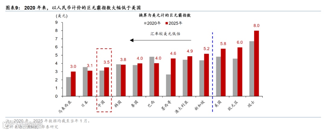 目前人民币估值仍大幅低于均衡值。随着2022年3月美联储开始快速加息,人民币有效汇率经历了1990年来最大的一轮调整周期。2022年4月至今年6月,人民币实际有效汇率累计回调19%,名义有效汇率回调7.7%(图表8)。近年来,中国出口占全球的比例持续上升,贸易顺差和经常项目顺差占比也节节攀升,显示人民币估值有所低估。从购买力平价的角度看,多项可比可贸易价格指标亦指向人民币汇率有所低估,如以人民币计价的经济学人巨无霸指数(Big Mac Index)较美元计价的指数低约40%,且2020年来大幅调整(图表9)。