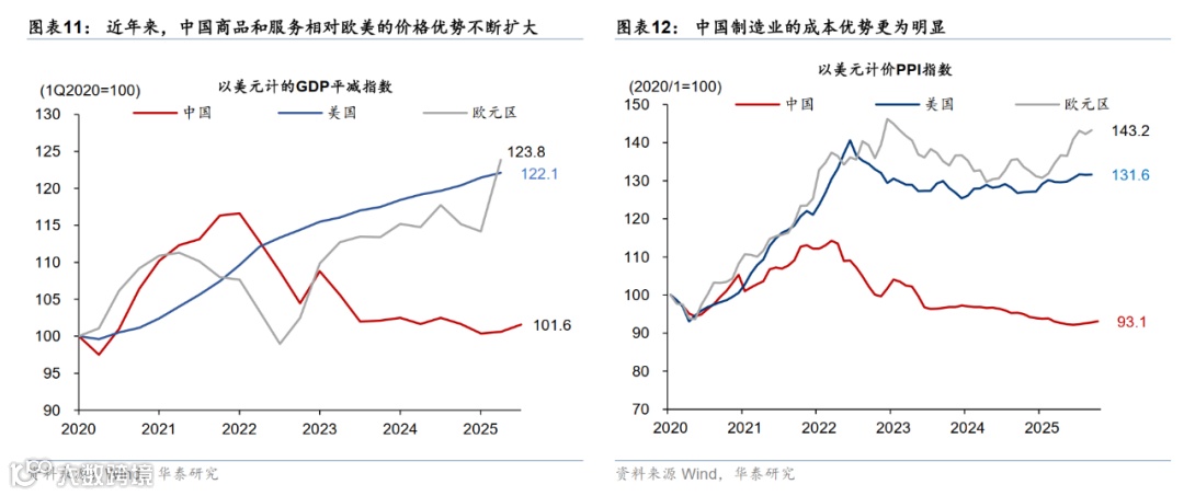 由于中国成本优化速度大幅快于欧美,(年化4-5%的)适度升值不会腐蚀总出口的竞争力,反而可能降低贸易摩擦压力。受益于国内产业链齐全、大市场、人才红利等诸多有利因素,中国商品和服务相对欧美的价格优势不断扩大。去年全年,中国以美元计的GDP平减指数的同比变动分别低于欧元区、美国5.4、4.9个百分点,今年上半年进一步较欧、美低5.1、4.1个百分点(图表11)。类似地,今年前9个月,中国以美元计PPI指数的同比变动分别较欧、美低7.4、5.6个百分点,显示中国制造业的成本优势更为明显(图表12)。另一方面,中国出口竞争力提升带动货物贸易顺差不断走阔,如今年前10个月货物贸易顺差同比增长22%,导致对美国以外国家的贸易摩擦压力有所上升。