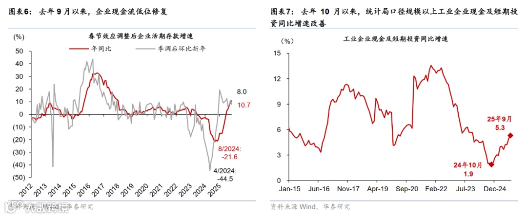 同时,下半年来,物价指标边际修复;在今年财政更为积极和地产企业加速出清的背景下,企业现金流增长低位回升。今年8月以来,PPI同比降幅持续收窄,尤其是10月环比年内首次转正,显示工业企业供需格局边际改善。同时,随着地方政府加大化债及偿还拖欠账款的力度,叠加开发商债务重组持续推进,企业现金流状况低位修复(图表6)。去年11月以来,工业企业持有现金及短期投资同比增速持续温和回升(图表7)。