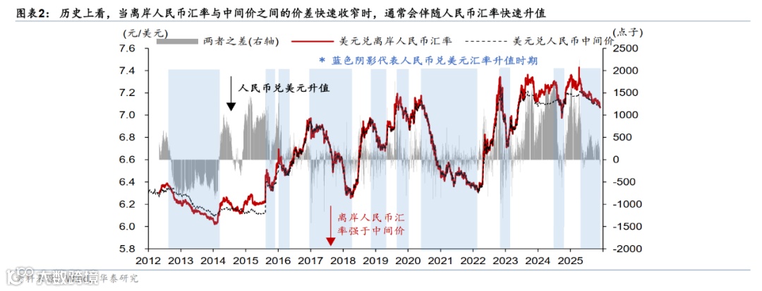 从交易走势观察,人民币升值的一致预期正在形成。历史上,经历较长的下行周期后,人民币汇率“转向”往往会经历一个反复“磨底”,蓄势,温和升值,以及加速升值的过程。如在经历1998-2002低通胀时期后的2003-07升值周期、此后的2017-18、2020-21升值周期也都经历了这些阶段。今年5月,在美国对华145%“极限关税”快速降级后,人民币汇率就开启了蓄势升值的过程。第一阶段,人民币兑一篮子汇率继续调整,但兑美元汇率稳中有升,7月后,人民币兑一篮子货币开始升值,而这一趋势在9月后开始加速演进——7月来,人民币兑一篮子货币升值2.8%,兑亚洲另一个主要经济体日本的汇率上升值9.4%(图表1)。近期,虽然美元汇率回升,但人民币走势稳健,且离岸人民币走势更强,升值领先于在岸和人民币中间价汇率。由于离岸人民币汇率的调整速度更快,历史上看,当离岸人民币汇率与中间价之间的价差快速收窄、甚至离岸汇率开始强于中间价时,通常会伴随人民币汇率升值加速(图表2)。