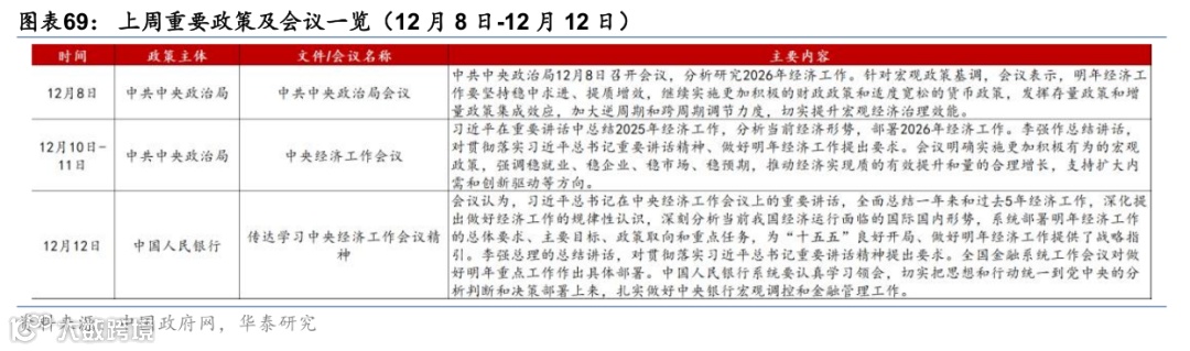(1)12月8日,中共中央政治局召开会议,分析研究2026年经济工作。会议在总结 2025 年经济工作的基础上,系统分析当前国内外形势,认为今年在顶压前行中仍将顺利完成经济社会发展主要目标,“十四五”有望圆满收官,为“十五五”良好开局打下基础。会议提出,明年经济工作要坚持稳中求进、提质增效,继续实施更加积极有为的宏观政策,通过发挥存量政策与增量政策的合力,加大逆周期和跨周期调节力度,巩固经济稳中向好态势。重申要统筹扩大内需和深化供给侧结构性改革,统筹高质量发展和安全,推动现代化产业体系建设和重点领域风险化解,强化改革开放与科技创新的支撑作用。
