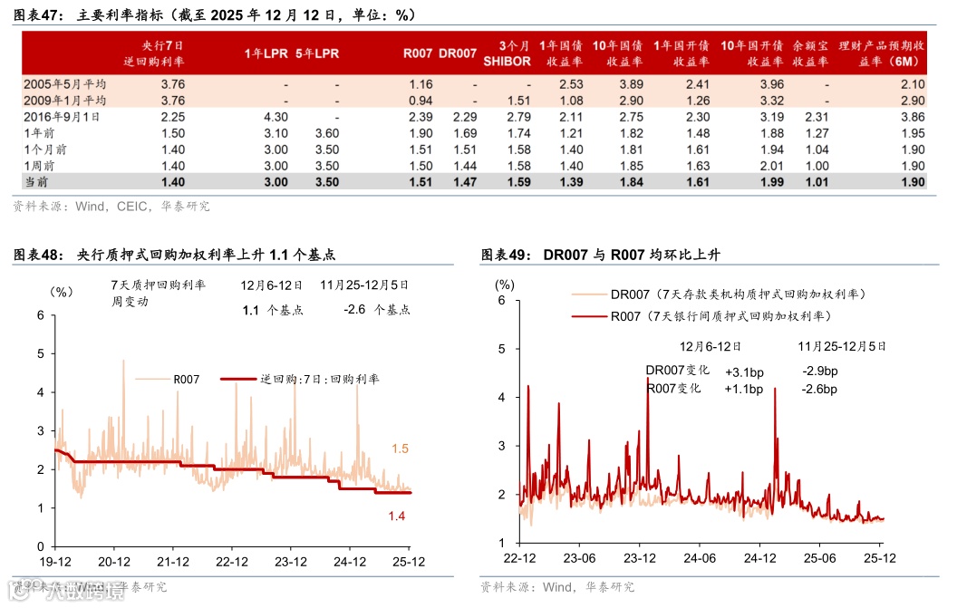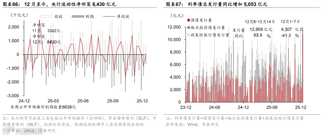 (3)12月12日,中国人民银行党委召开会议专题传达学习中央经济工作会议精神。会议提出要把促进经济稳定增长、物价合理回升作为货币政策重要考量,继续实施适度宽松的货币政策,加快推进金融供给侧结构性改革,灵活运用降准、降息等多种工具,保持流动性充裕,推动社会综合融资成本维持在较低水平,并强化与积极财政政策的协同发力,更大力度支持扩大内需、科技创新、中小微企业和民营经济,同时保持人民币汇率在合理均衡水平上的基本稳定。金融监管总局则强调要落实好全国金融系统工作会议部署,稳步推进金融高水平开放,维护金融安全,服务实体经济和房地产市场平稳发展,推进人民币国际化和数字人民币建设,确保金融基础设施安全稳定运行,为 2026 年宏观政策落地提供有力金融支撑。