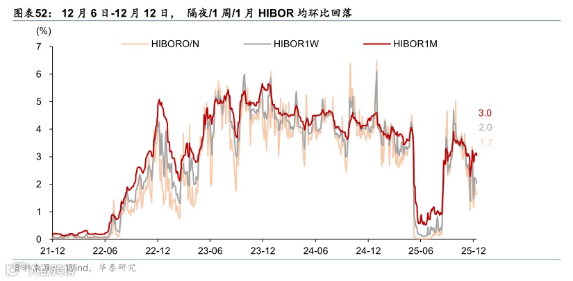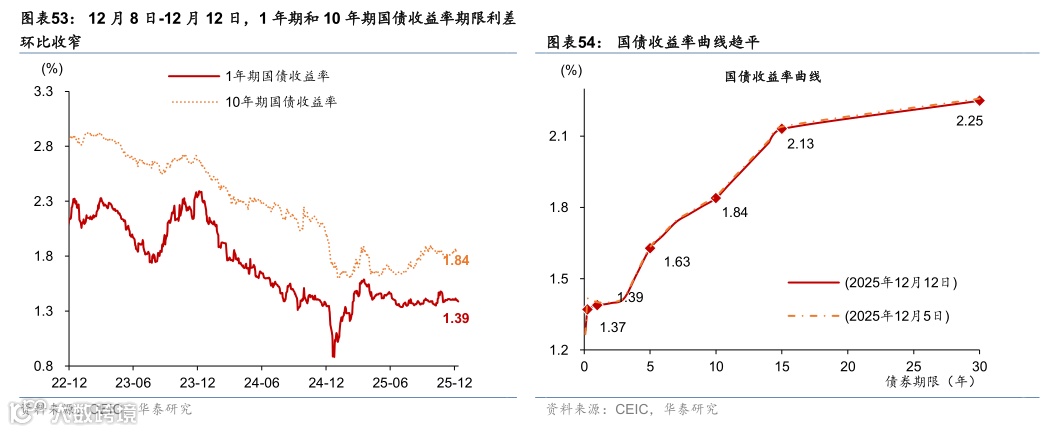 流动性指标:银行间流动性偏紧,同业存单发行利率环比上行。银行间利率利差整体上行,DR007环比上升3.1个基点,R007环比上升1.1个基点。1年期国债收益率环比下降1.3个基点,10年期/30年期国债收益率均环比下降约0.9个基点,国债收益率曲线趋平。上周央行质押式回购加权利率上升1.1个基点;同业存单净发行量环比下行,发行利率环比上行。隔夜/1周/1月HIBOR环比均下行。